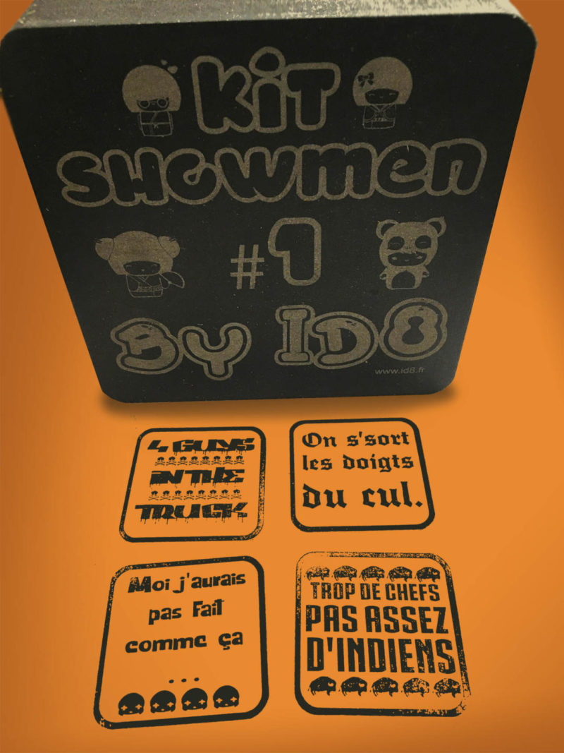 Descriptif : Coffret de 4 tampons humoristiques « Showmen #1 ». Taille d’un tampon 48MM/48MM. Taille du coffret 130MM/130MM. Gravure laser. Matériau : Valchromat (medium teinté masse) 30MM d’épaisseur huilé. 100% fabriqué dans nos ateliers, en France.